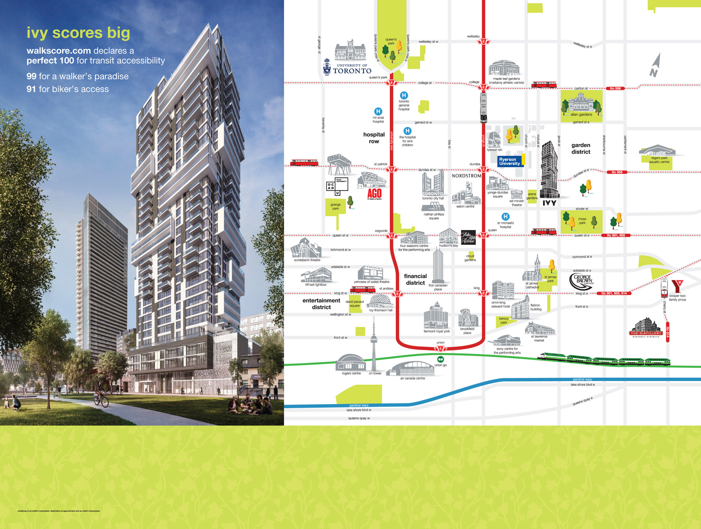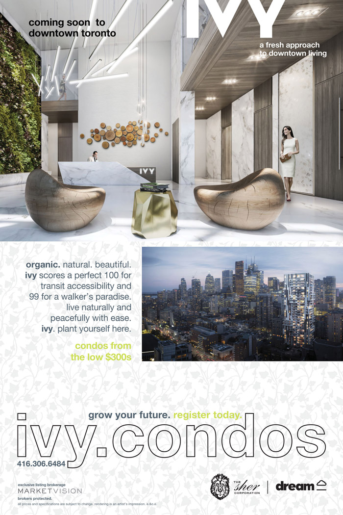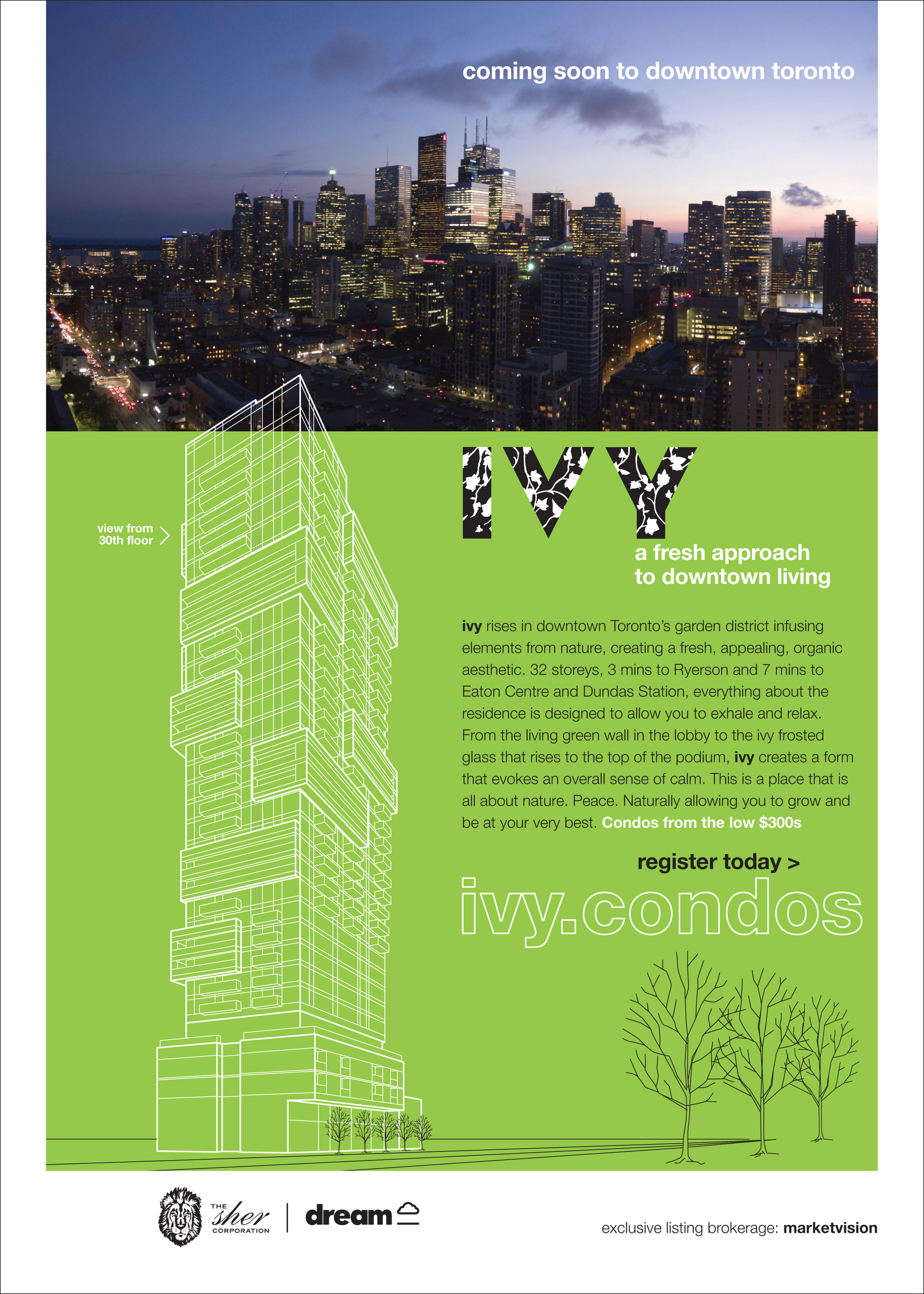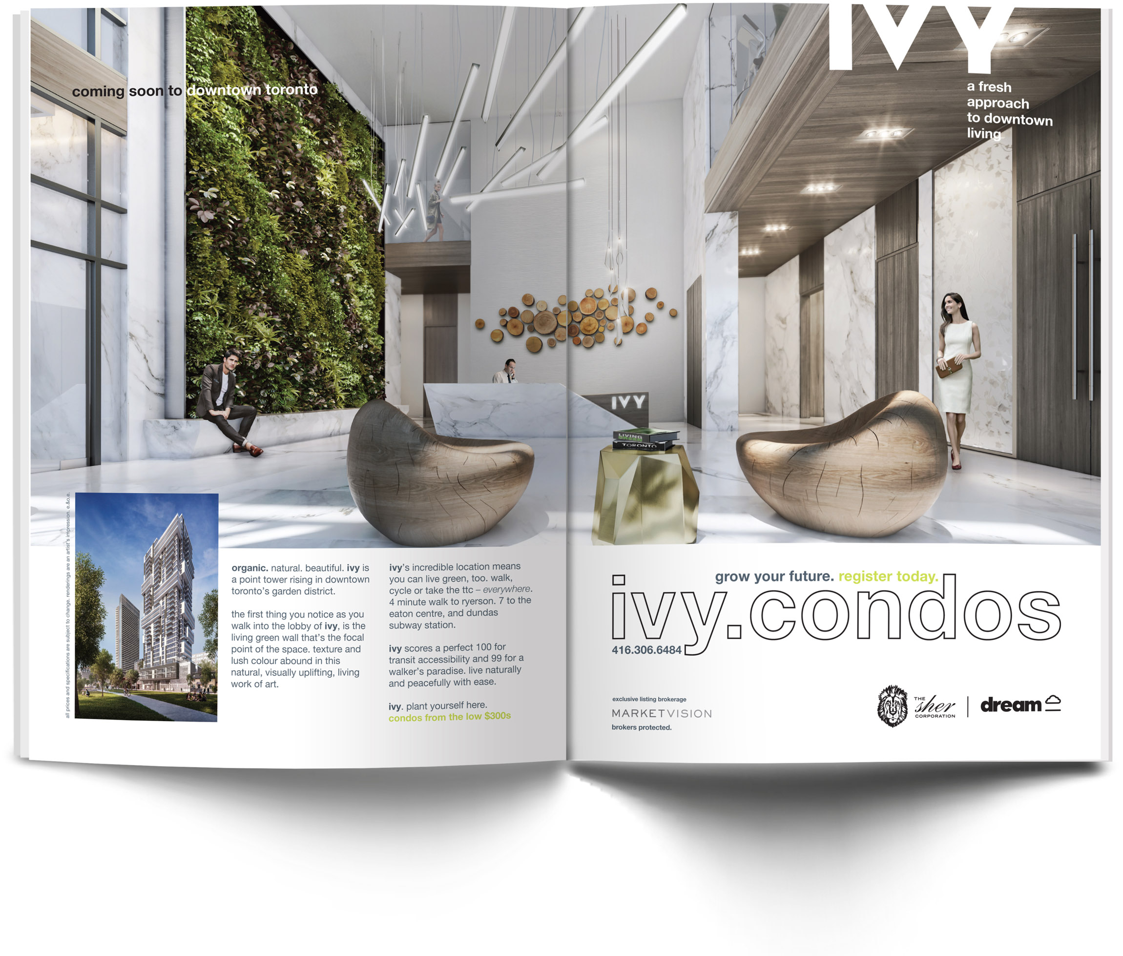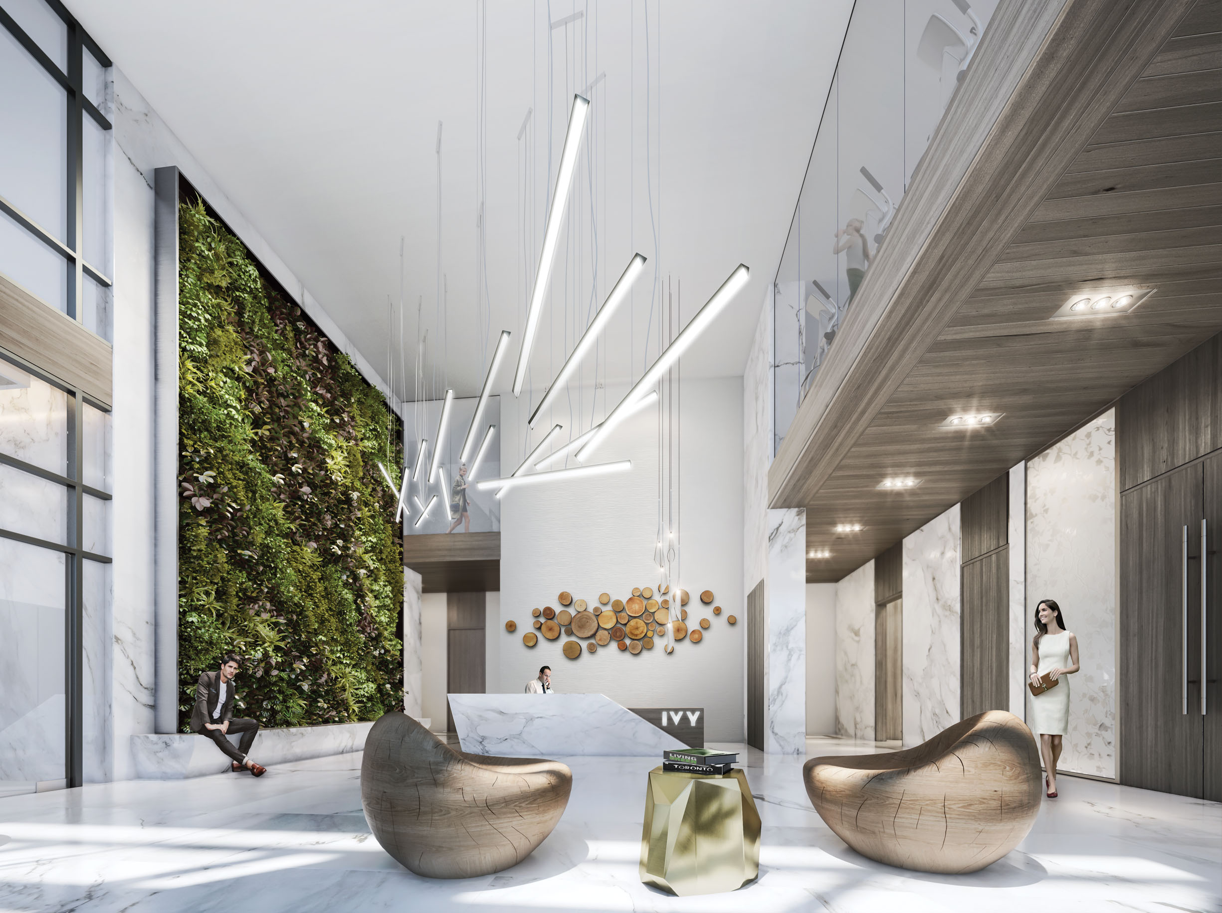 organic. natural. beautiful. ivy is a point tower rising in downtown toronto’s garden district. from the living green wall in the lobby to the frosted leaf patterns on the building’s exterior, everything about ivy makes you exhale and relax.
