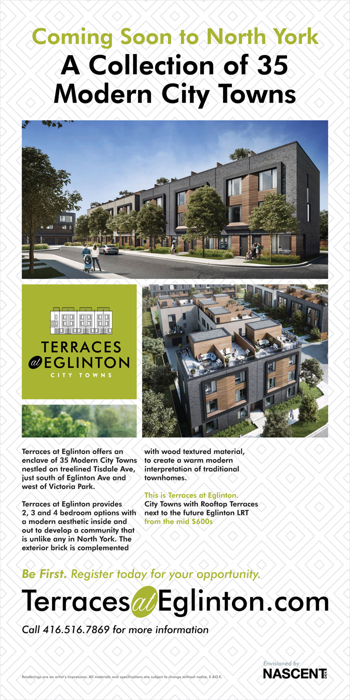 Terraces at Eglinton offers a collection of 35 modern towns nestled on treelined Tisdale Avenue, just south of Eglinton Avenue and west of Victoria Park. Comprising of 6 unique blocks of towns, Terraces at Eglinton offers a modern aesthetic inside and out to develop a community that is unlike any in North York.