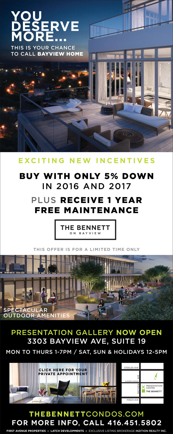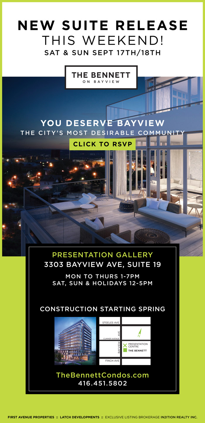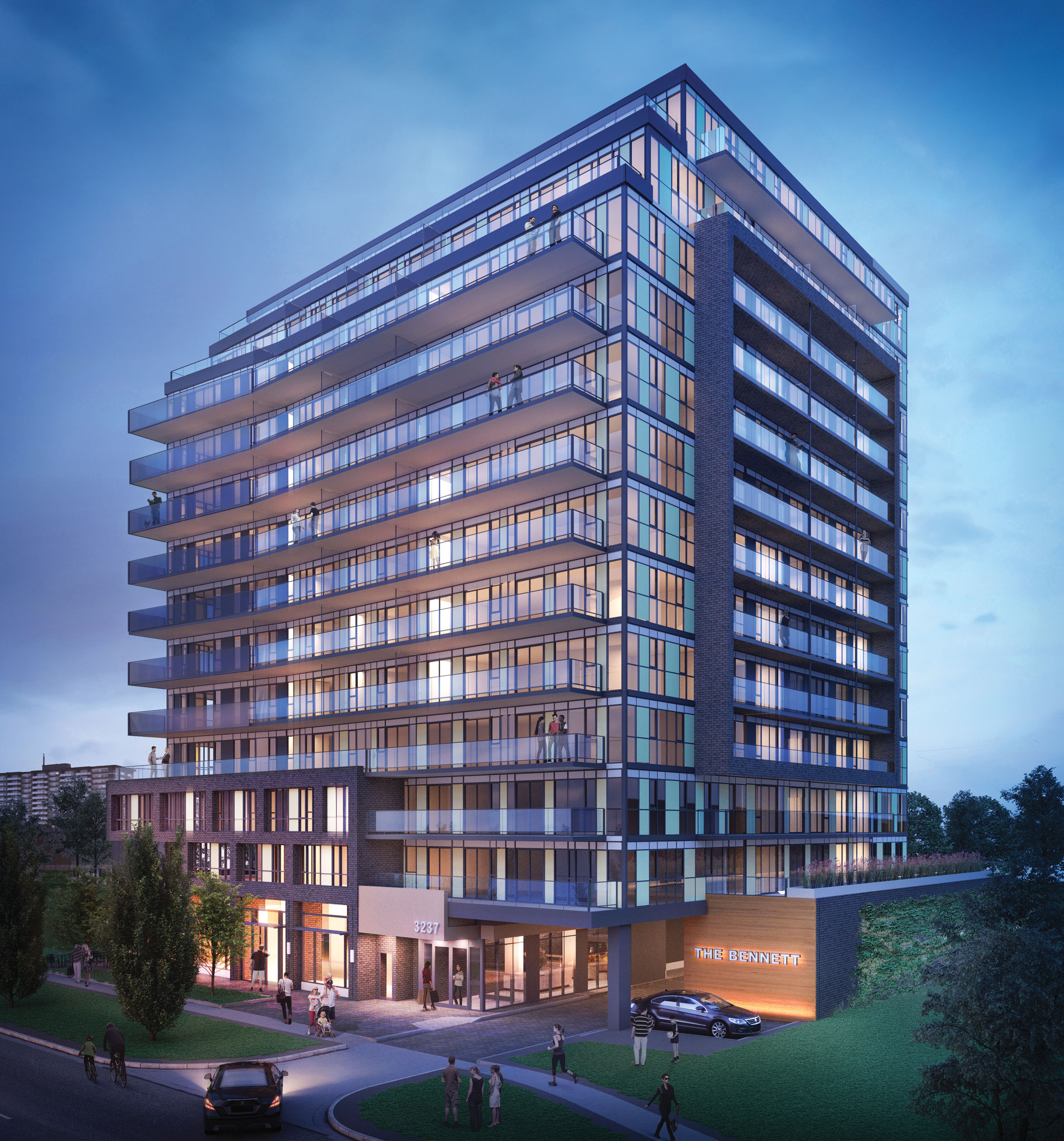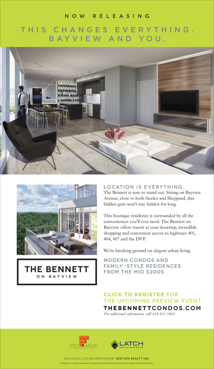 Located on the east side of Bayview just north of Finch, this geometric structure is putting a fresh new face on the neighbourhood. Thirteen storeys rise subtly above the street, with a design that evokes movement with two rotating cubes.