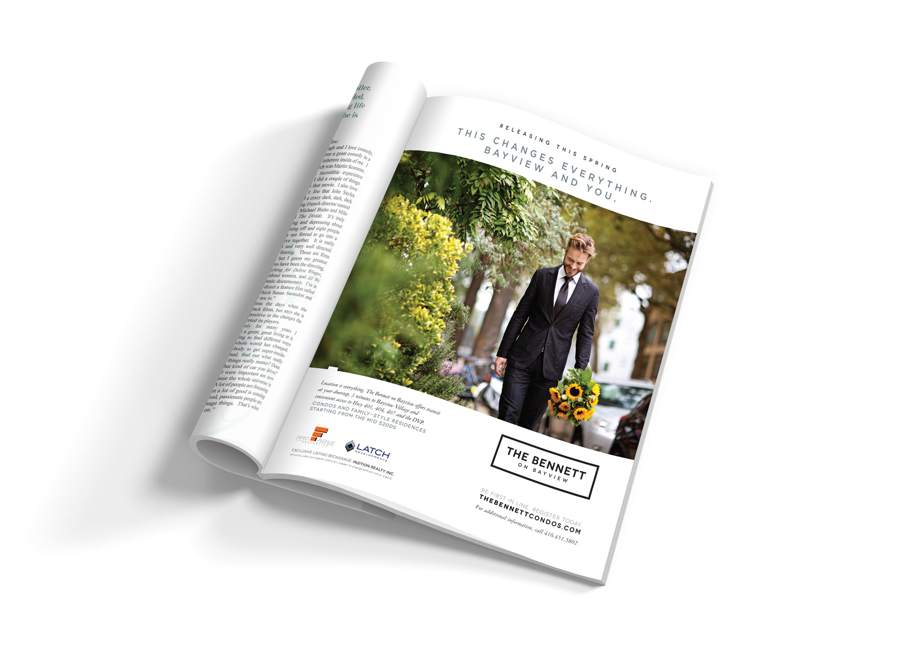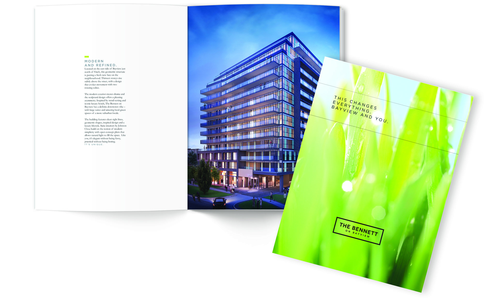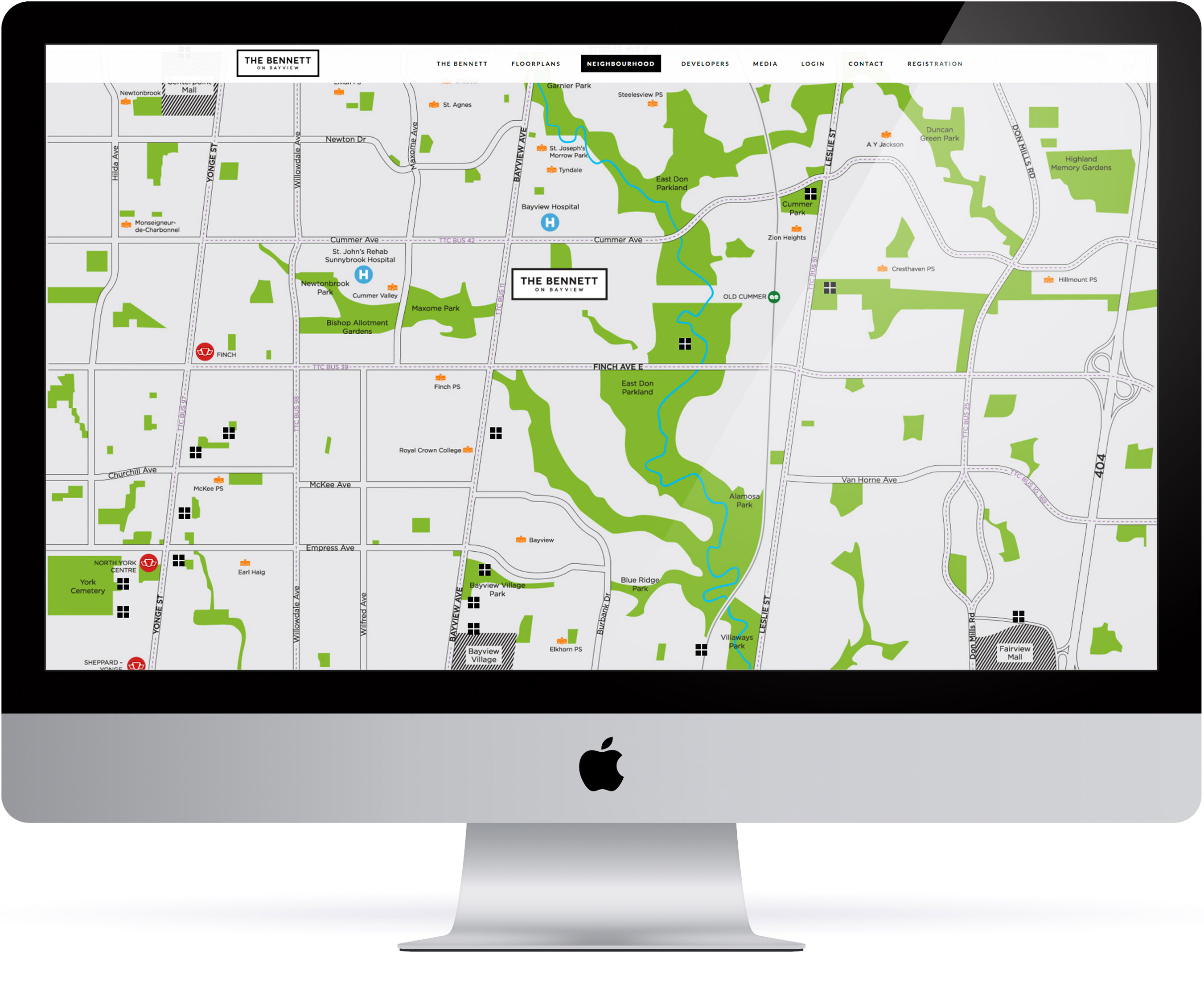 Located on the east side of Bayview just north of Finch, this geometric structure is putting a fresh new face on the neighbourhood. Thirteen storeys rise subtly above the street, with a design that evokes movement with two rotating cubes.