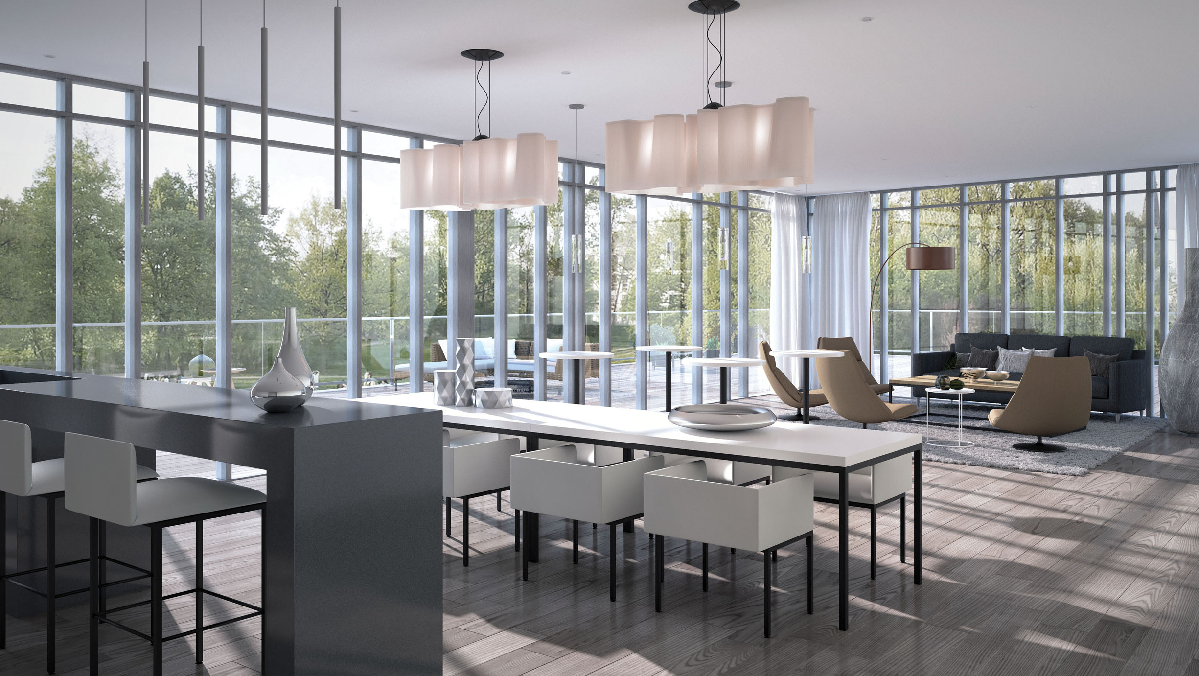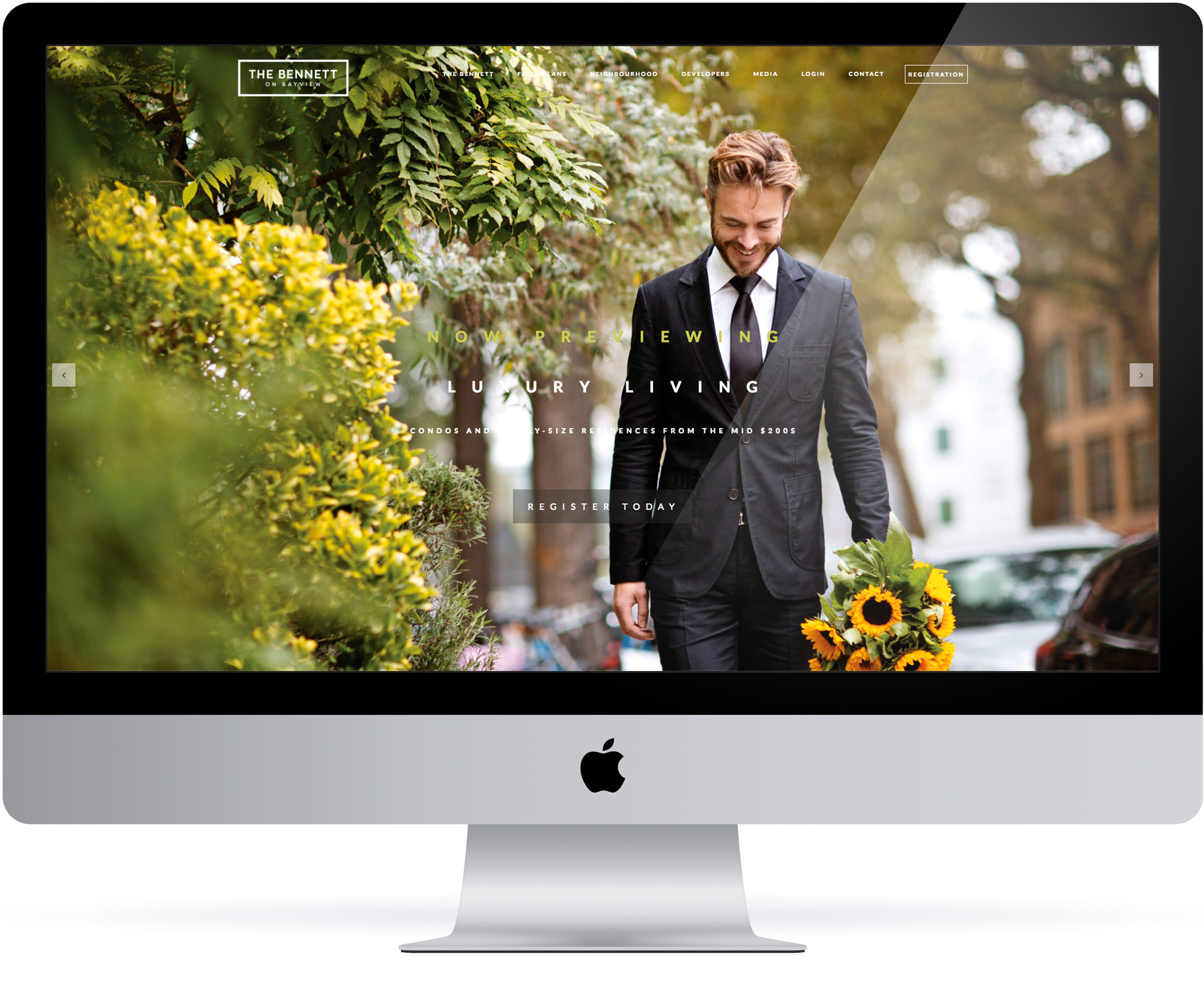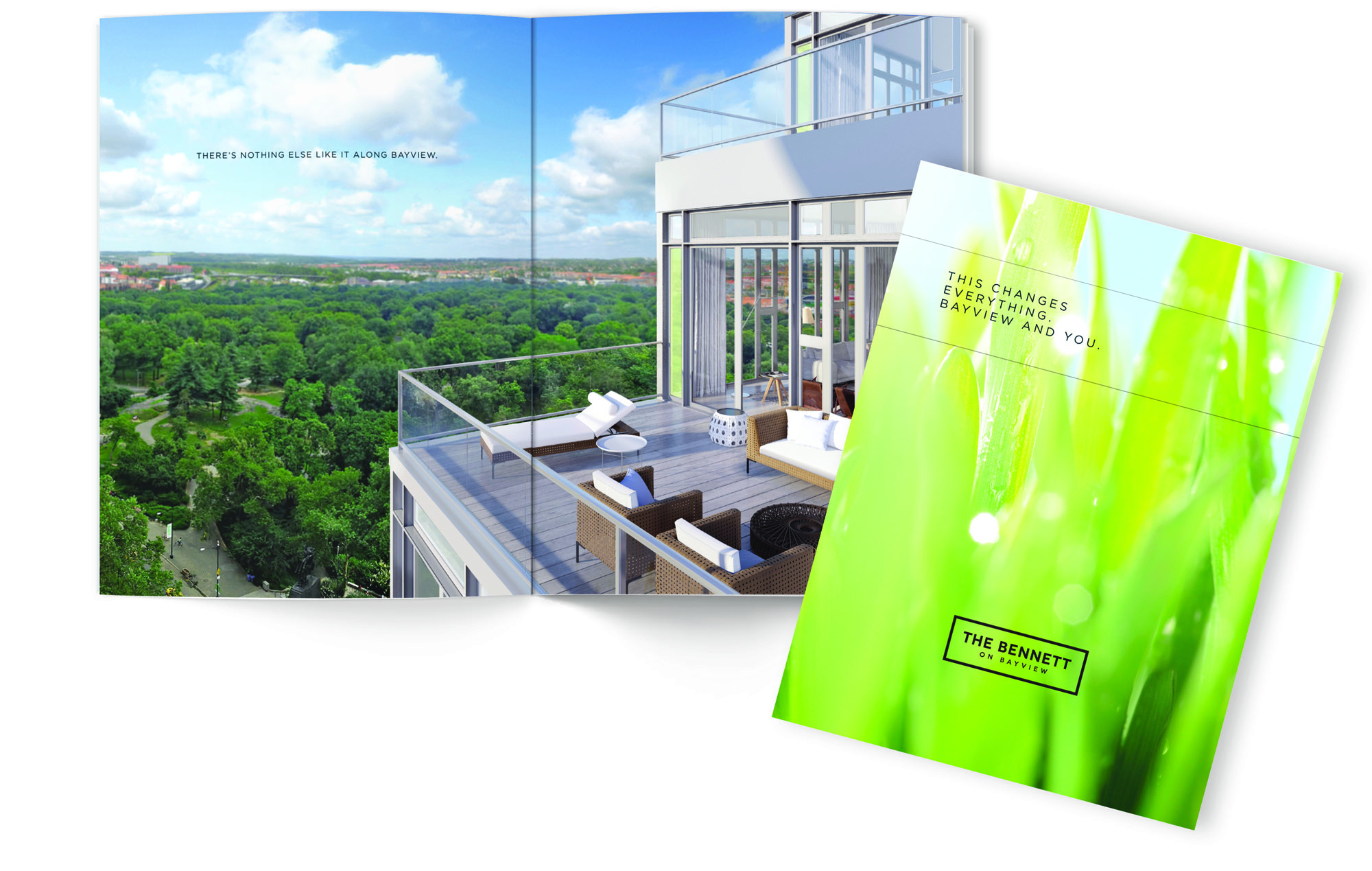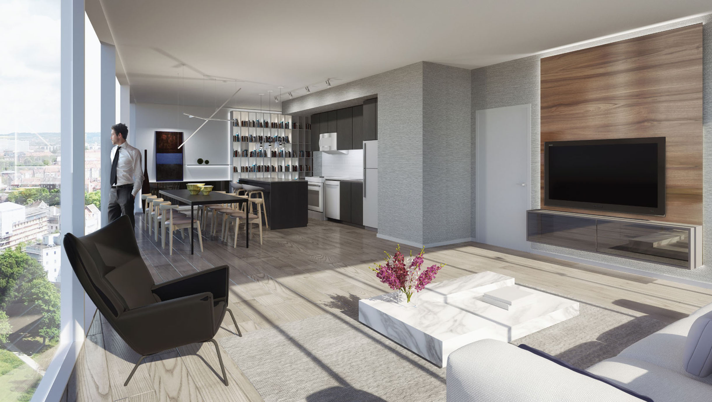 Located on the east side of Bayview just north of Finch, this geometric structure is putting a fresh new face on the neighbourhood. Thirteen storeys rise subtly above the street, with a design that evokes movement with two rotating cubes.