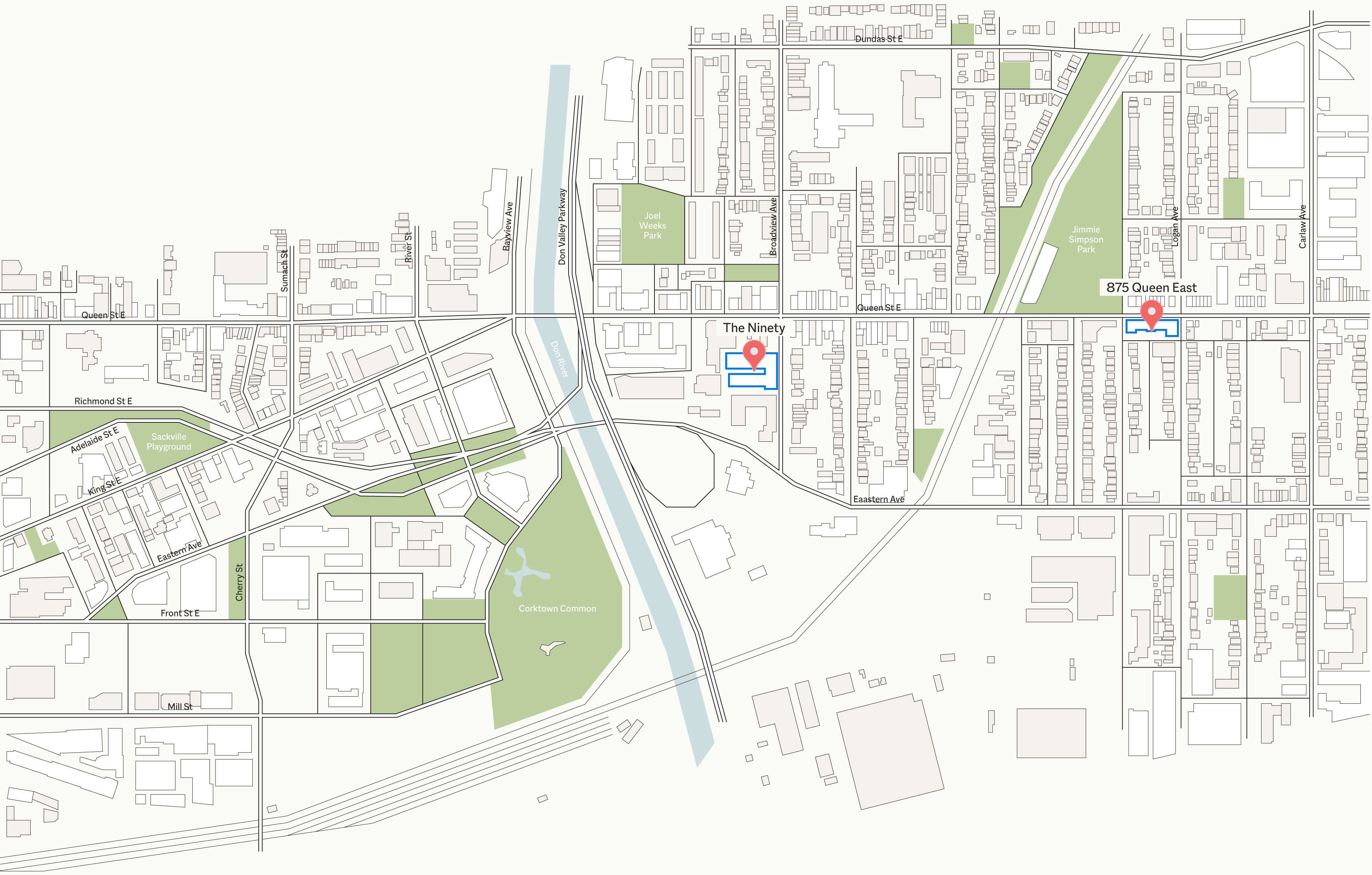 The site of the nine-storey, 222-unit building to be built at 90 Broadview, just south of Queen, is minutes by car or transit to the heart of the city. It is just as close to major arteries, a few steps to public transit in the heart of the Queen St. E. Broadview Village and a hop, skip and jump to vibrant Leslieville which flows into the Beach.