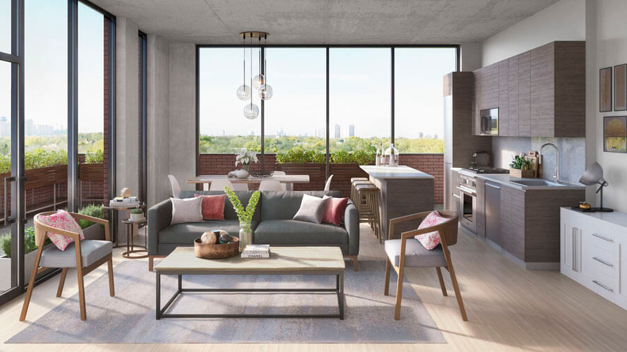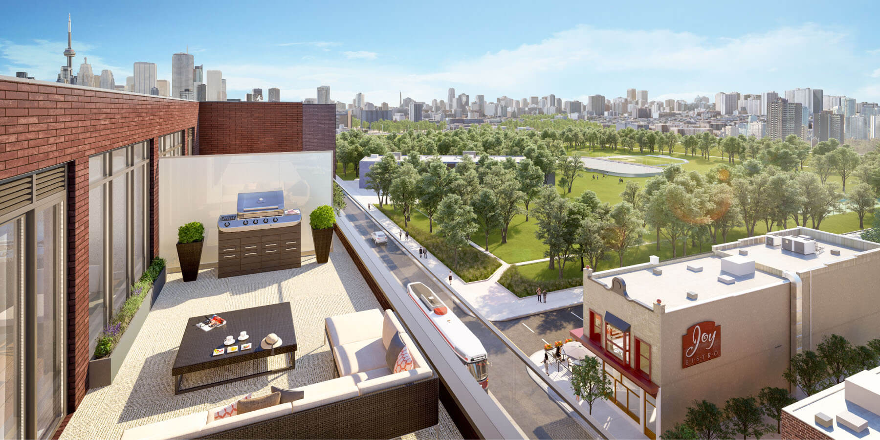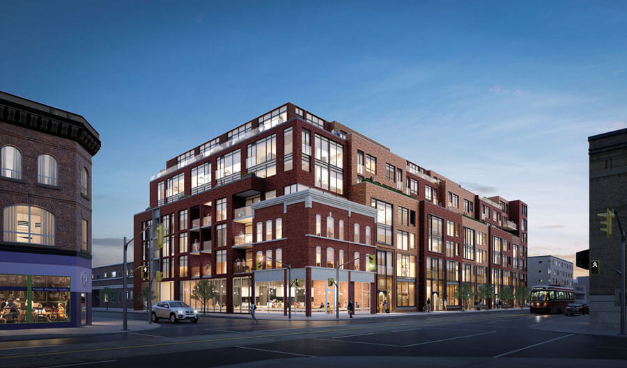 The seven storeys of loft-inspired residence overlooks the lively Queen Street East and incorporates organic architectural building stepbacks offering the natural elements of modern balconies and terraces.