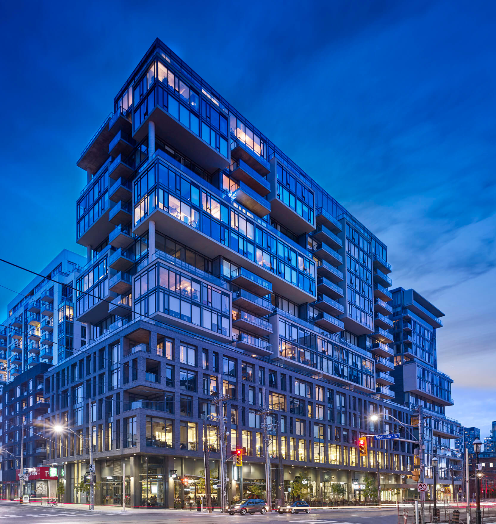 One Eleven offers inspired design in a fantastic location. Boasting 17 storeys of loft-style condominiums, it’s a chance to live large in vibrant King West. The architecture integrates seamlessly into the neighbourhood: the glass cubes and brick podium are a modern interpretation of the area’s historic warehouses. Light-filled studios, lofts and penthouses are paired with retail and office space below, providing residents with an enviable live, work and play lifestyle.
