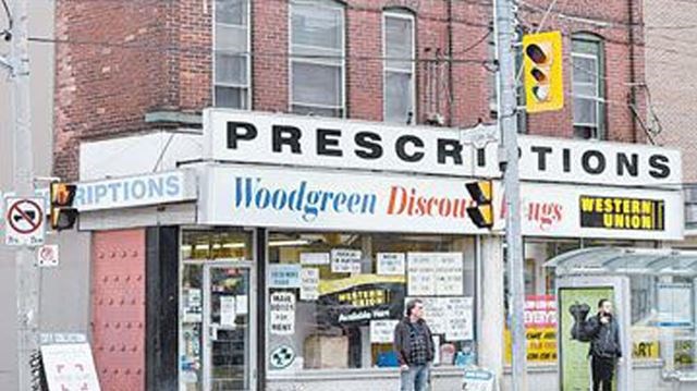 The building in question is the circa 1888 Burgess Building at the southwest corner of Queen Street East and Logan Avenue, whose current main-floor tenant is Woodgreen Discount Drugs. Admittedly in rough shape, the three-storey structure, which is Leslieville’s first medical building, has a number of notable architectural features: moulded brick courses, pilasters, brackets, a variety of windows and a detailed cornice.