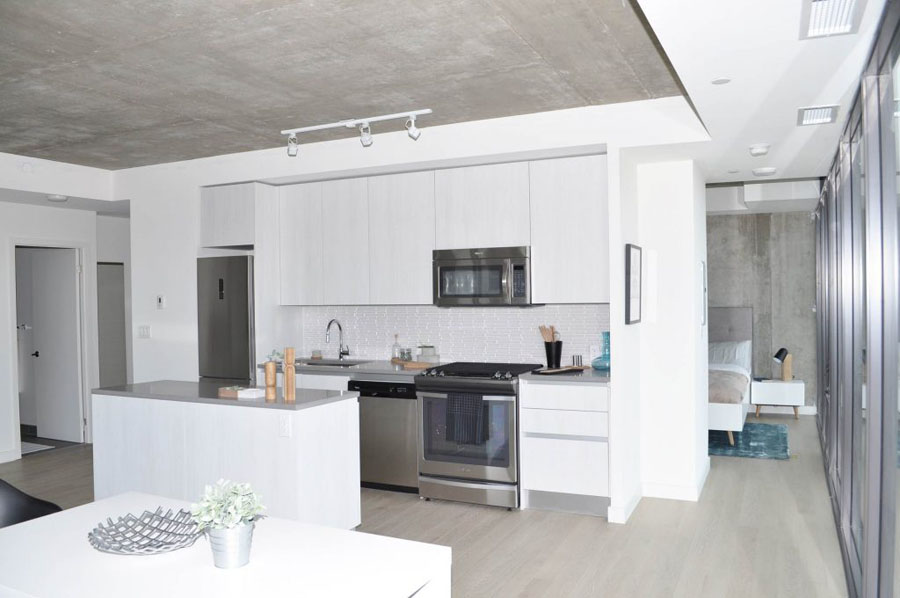 Interiors are characterized by Scavolini kitchen cabinetry, functional islands, stainless steel appliances, stone countertops and quality backsplash tiles. Exposed concrete ceilings, pillars and feature walls give the space a deconstructed look, while pre-finished engineered wood floors maintains its elegance. Additional features include deep soaker tubs, ceramic wall tile surrounds and rain style showerheads, as well as opaque glass sliding bedroom doors, nine foot ceilings in principal rooms and gas hookups for barbecues. Prices start from the $300,000s — one and two-level suites are still available.