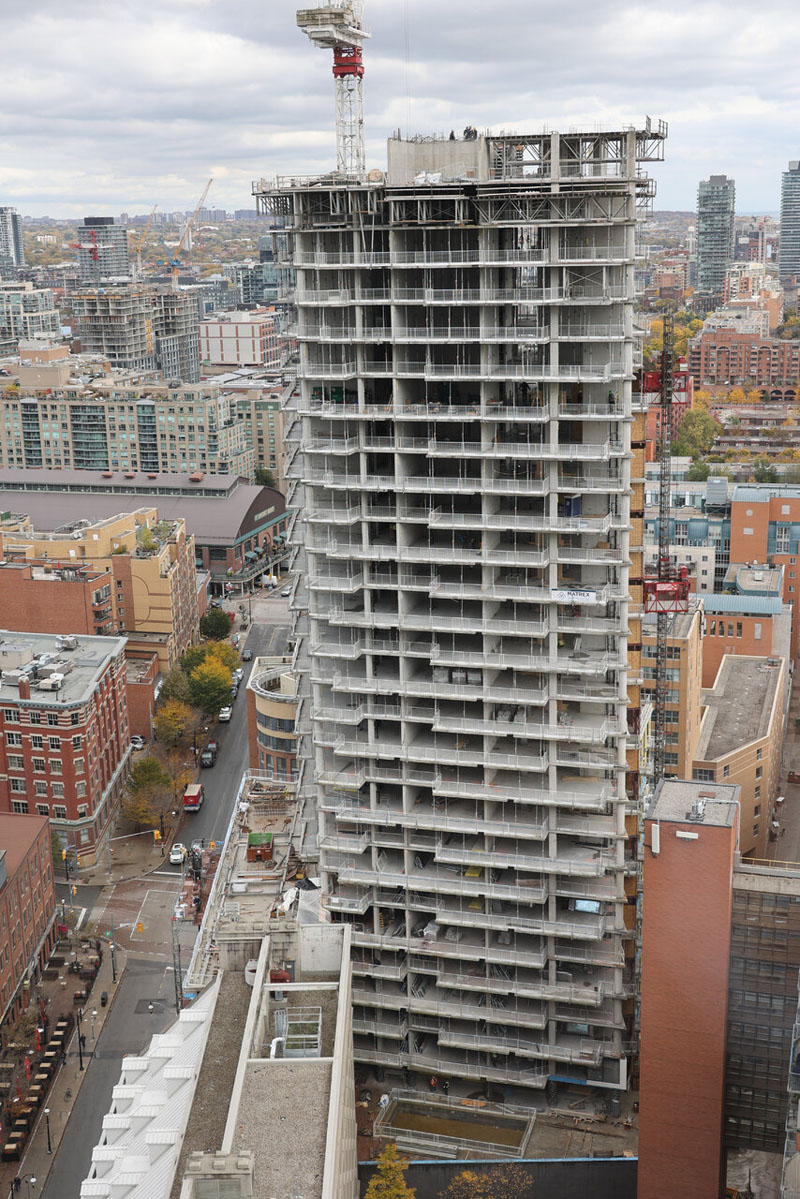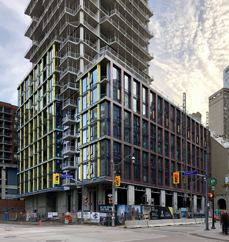 Construction is pressing along on the southwest corner of Church Street and The Esplanade in Toronto's St Lawrence Market area, where a new condominium tower from Harhay Developments and Carttera Private Equities is racing towards welcoming its first residents later this year.