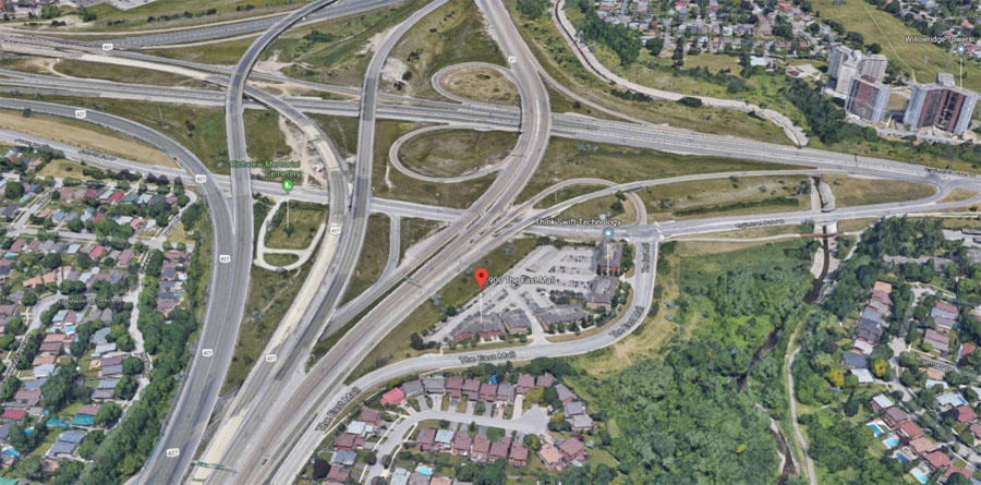 An application submitted to the City of Toronto seeks an Official Plan Amendment and rezoning to permit four new condominium towers on a suburban office campus site at 900 The East Mall on the southwest corner with Eglinton Avenue, and located just next to the meeting point of Highways 401 and 427 in Etobicoke.