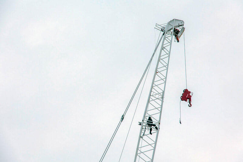 Crew members—attached safely to arresting gear—fixed individual sections of the tower crane to the mobile rig using lines. The sections were then unbolted from the main crane assembly and carefully lowered down to waiting flatbed trucks at street level.